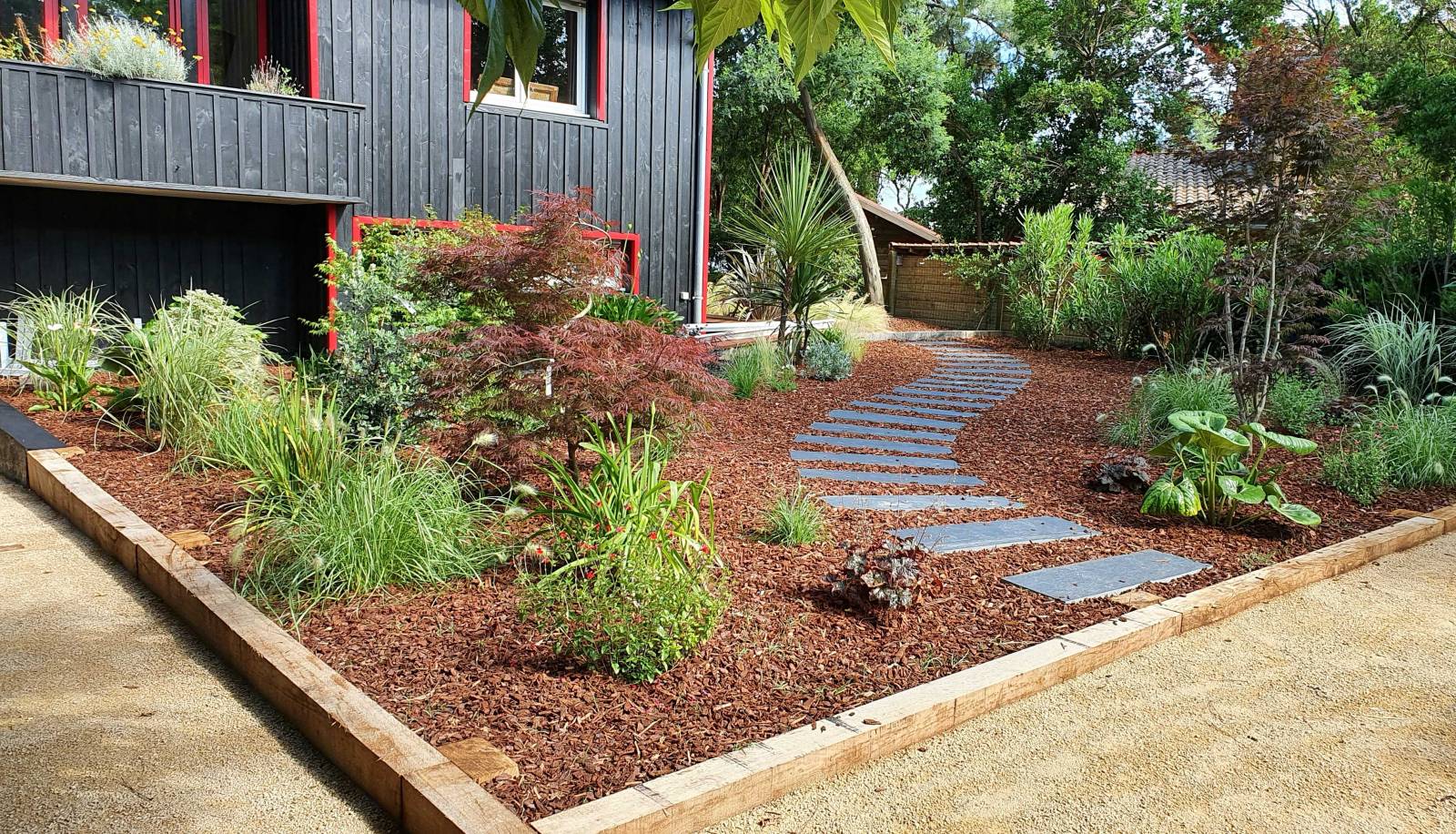 Opter pour un paillage décoratif naturel en écorces de pins apporte un contraste remarquable entre les massifs composés de graminées, Agapanthes et autres vivaces. Outre le coté écologique de la démarche, cette technique est prisée pour sa capacité à magnifier et à mettre en valeur les teintes argentées et vertes des végétaux plantés, tout en conférant une fonction protectrice essentielle au sol.